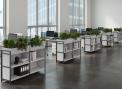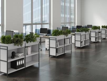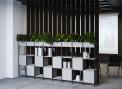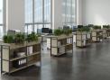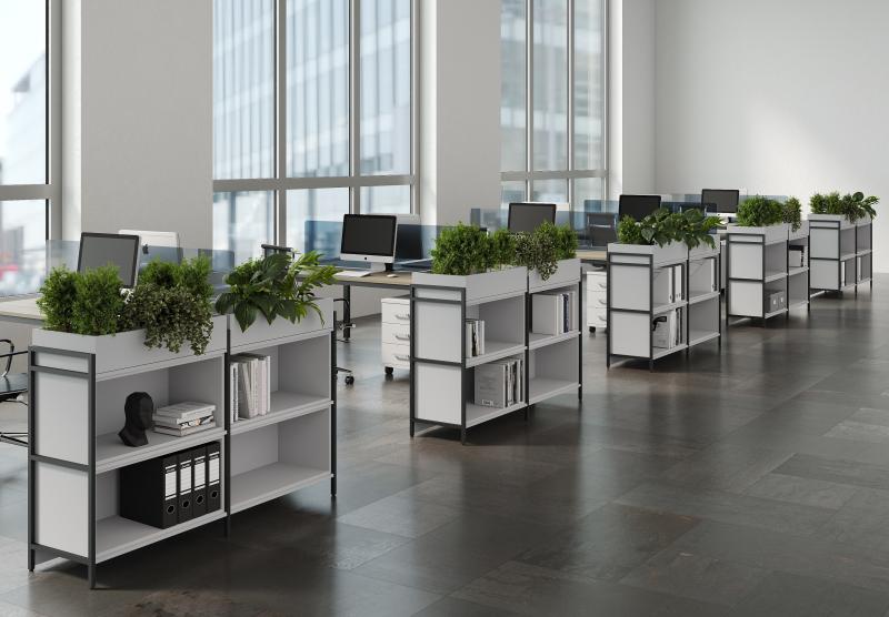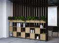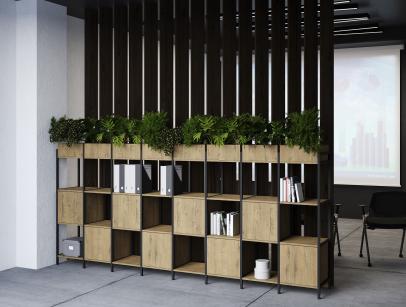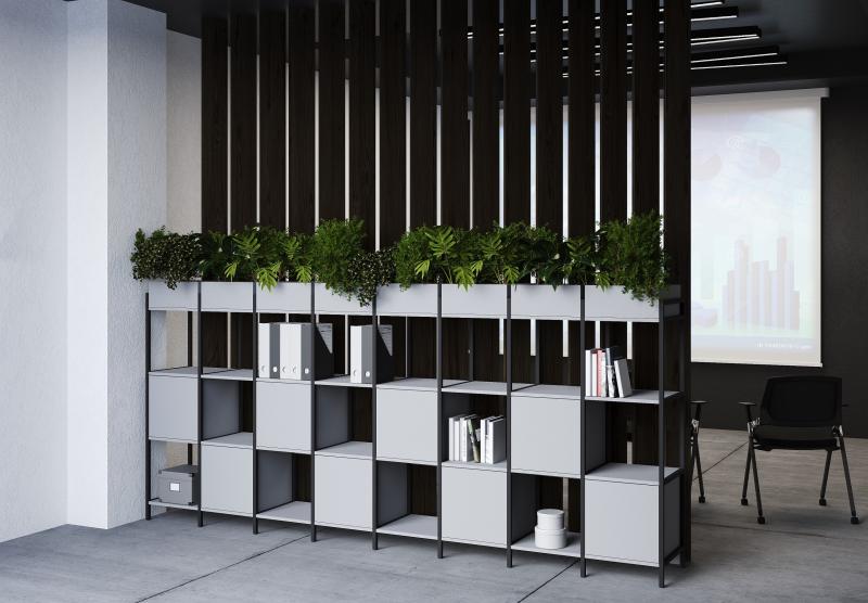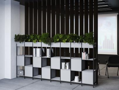 Функциональное разнообразие: Система включает не только открытые полки, но и мобильные стеллажи, закрытые модули, секции с выдвижными ящиками и даже декоративные кашпо для озеленения офиса.